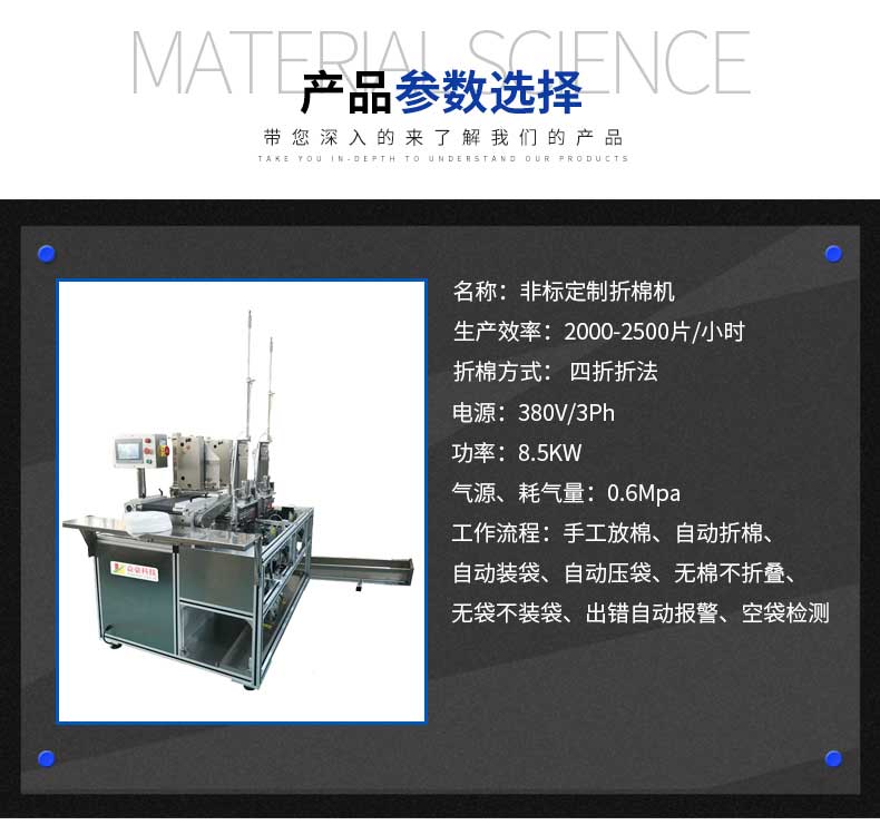 1、工作流程:手工放棉、自動折棉、自動裝袋,自動壓袋、無棉不折疊,無袋不裝袋,出錯自動報警,空袋檢測;