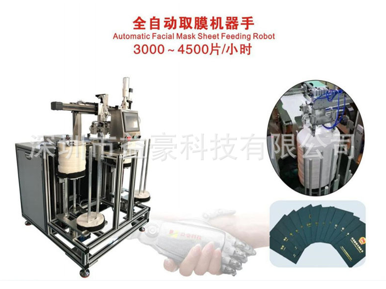 益豪科技公司旗下還研發(fā)生產(chǎn)了 眼膜折疊機(jī)”“膜布檢測機(jī)”、”稱重機(jī)”、”面膜點數(shù)堆疊機(jī)”、”全自動取膜機(jī)器手”、”開盒機(jī)”等一系列面膜生產(chǎn)配套設(shè)備,其中“膜布檢測機(jī)”可以對接在“全自動面膜機(jī)”后面,實現(xiàn)對罐裝后的面膜袋進(jìn)行有無膜布的檢測;其中”稱重機(jī)”可以對接在“全自動面膜機(jī)”或“膜布檢測機(jī)”后面,對生產(chǎn)出的產(chǎn)品進(jìn)行重量檢測,對少重或超重的產(chǎn)品進(jìn)行剔除;其中”面膜點數(shù)堆疊機(jī)”可以對接在“全自動面膜機(jī)”、“膜布檢測機(jī)”或”稱重機(jī)”后面,實現(xiàn)對成品面膜袋的點數(shù)和堆疊,便于后續(xù)的包裝打包;其中”全自動取膜機(jī)器手”可以對接在“高速折棉入袋一體機(jī)”前面,實現(xiàn)自動取膜,減少了人工操作。