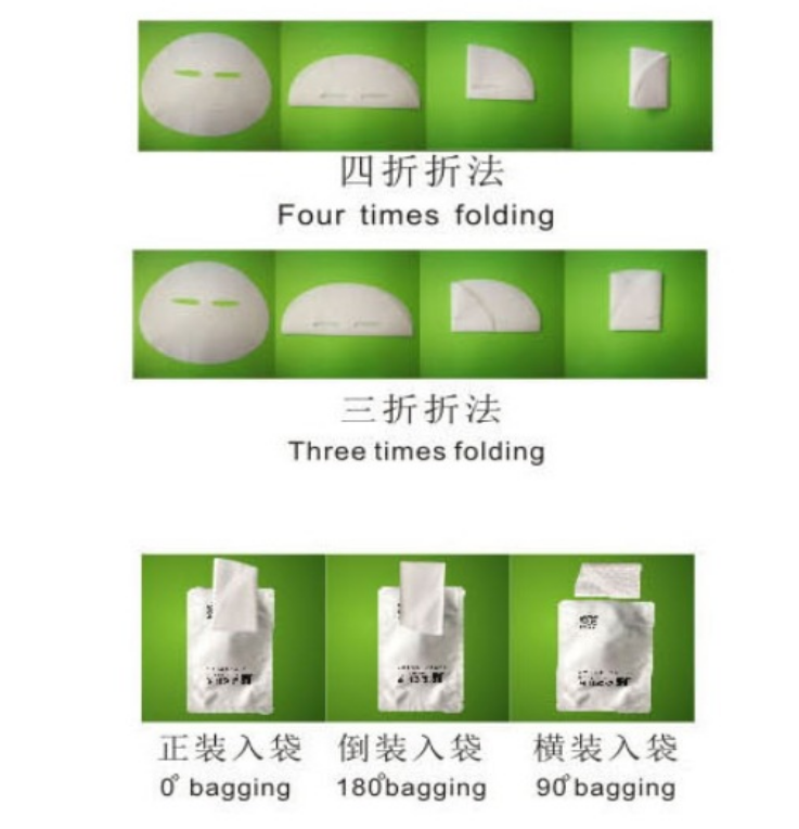 1、高速面膜折膜機的工作流程:手工放棉、自動折棉、自動轉向、自動裝袋、空袋檢測、自動壓袋、成品收集;